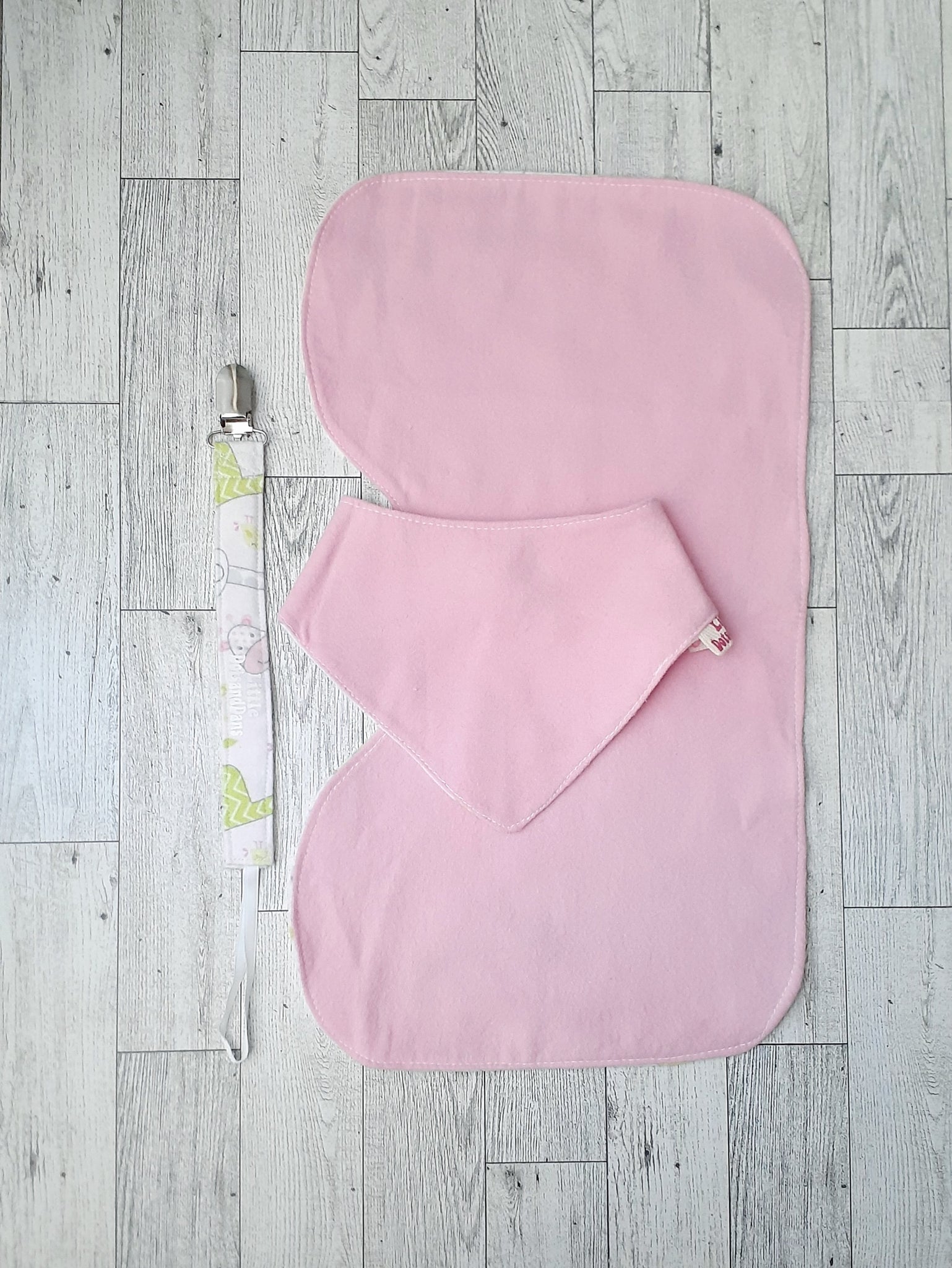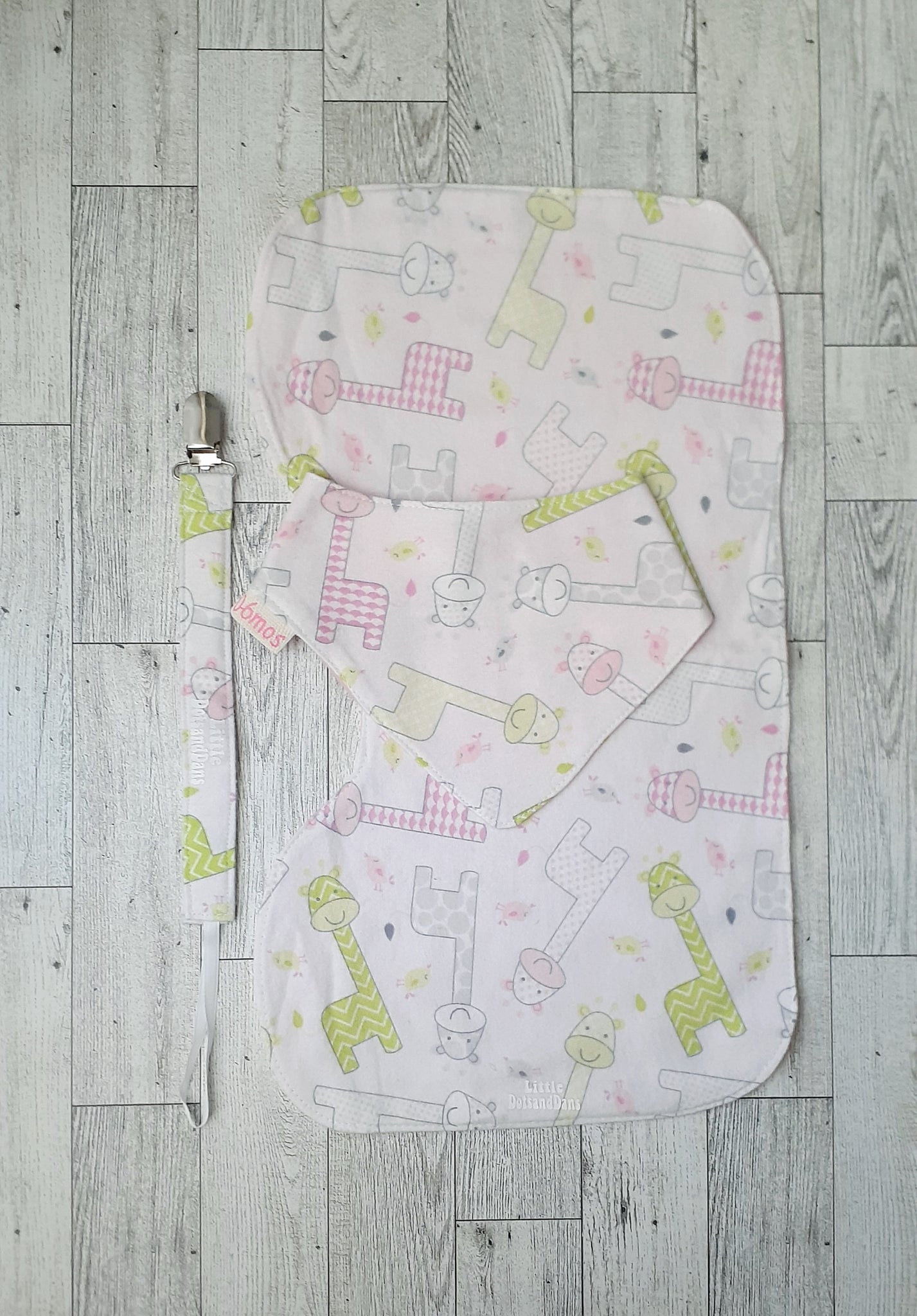 All items are handmade with 100% Flannel, set includes Bib, burp cloth, and pacifier clip. Bib and burp cloth are reversible. Machine wash cold No Bleach. Delicate Dryer Setting.