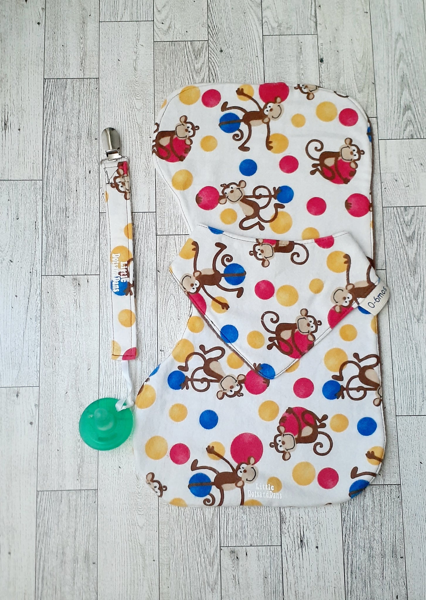 All items are handmade with 100% Fleece., set includes bib, burp cloth and pacifier clip. Bib and burp cloth are reversible. Machine wash cold No Bleach. Delicate Dryer Setting.